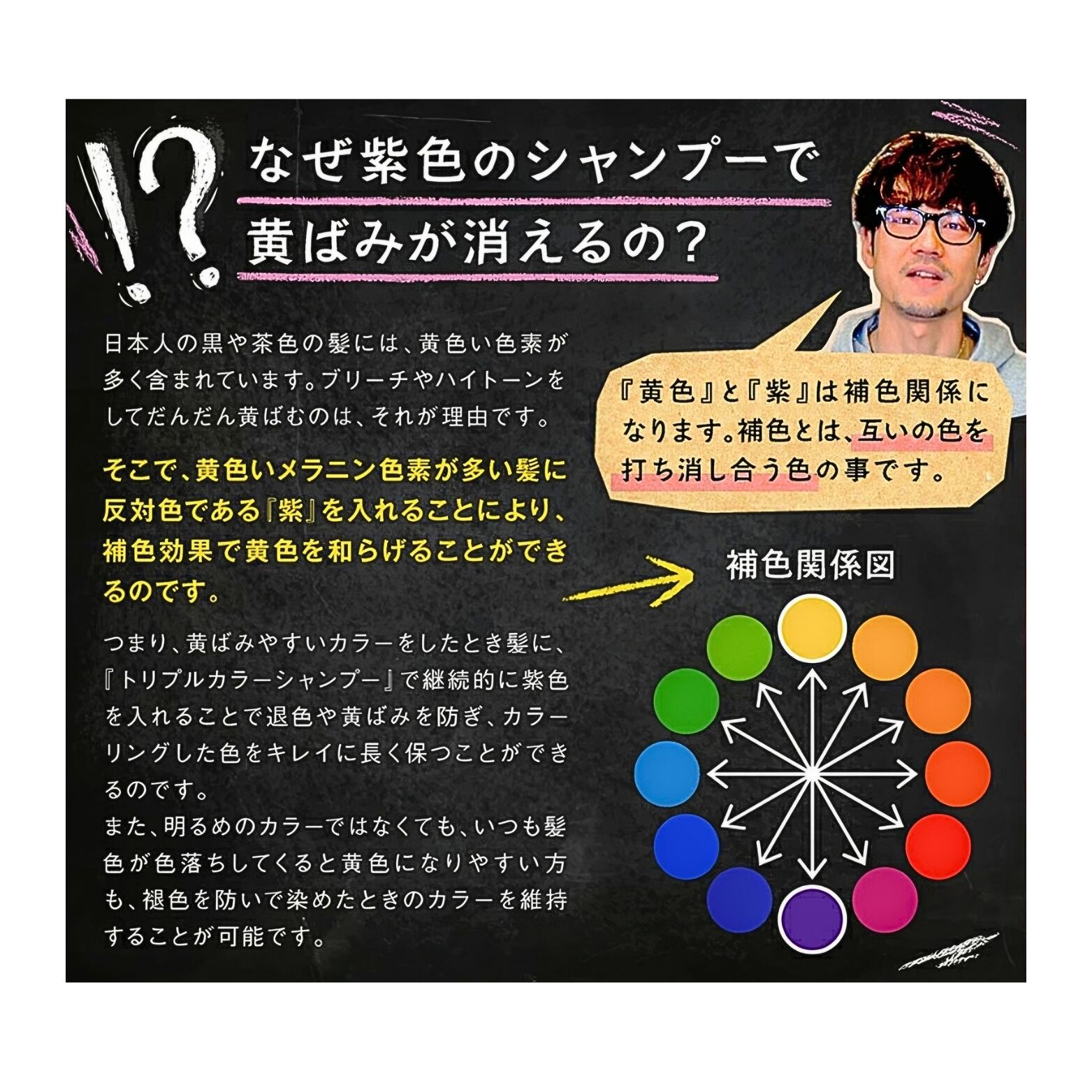 黄色の補色である紫を使うことで